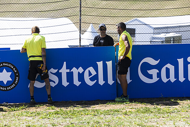 Na brněnském Masarykově okruhu finišují přípravy na motocyklovou Grand Prix. Na instalaci reklam se popdílejí i pracovníci promotérské organizace Dorna. (14. července 2025)