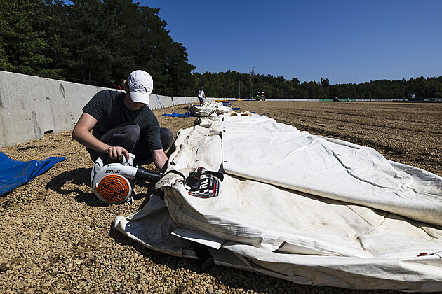 Na brněnském Masarykově okruhu finišují přípravy na motocyklovou Grand Prix. Nafukují se také bezpečnostní bariéry. (14. července 2025)
