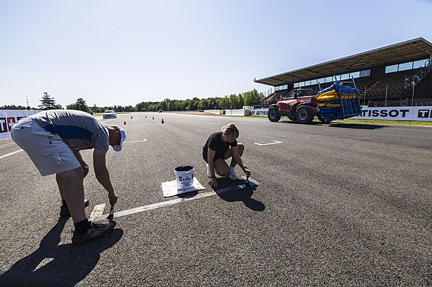 Na brněnském Masarykově okruhu finišují přípravy na motocyklovou Grand Prix. Mimo jiné se maluje startovní rošt. (14. července 2025)