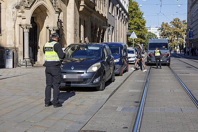 Strážníci na několika místech hlídají vjezd do historického centra Brna. Pokuty se ukázaly jako neúčinné. (říjen 2025)