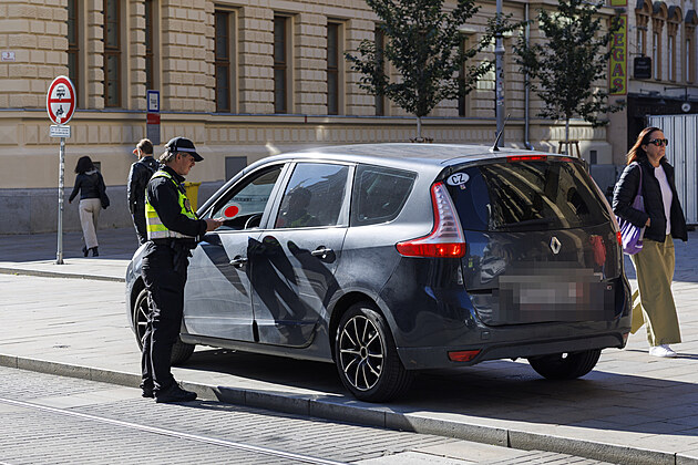 Strážníci na několika místech hlídají vjezd do historického centra Brna. Pokuty se ukázaly jako neúčinné. (říjen 2025)