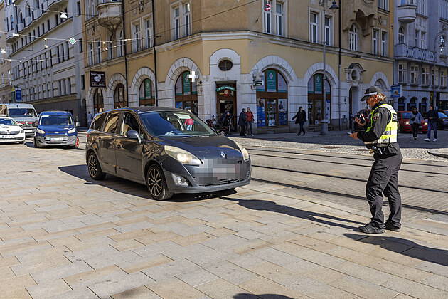 Strážníci na několika místech hlídají vjezd do historického centra Brna. Pokuty se ukázaly jako neúčinné. (říjen 2025)