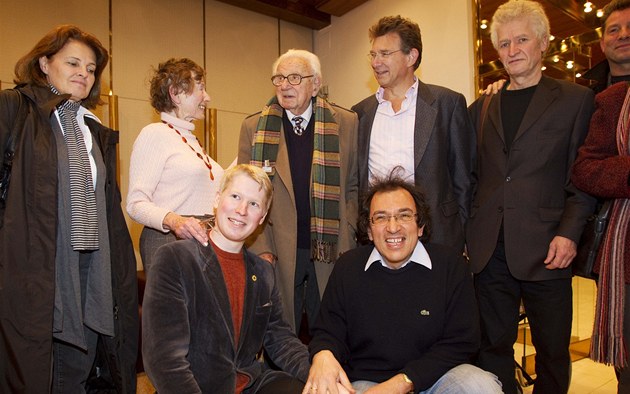 Sir Nicholas Winton, zachránce židovských dětí, na starém ruzyňském letiště se svou rodinou, v popředí režisér Matej Mináč. (19.1. 2011)