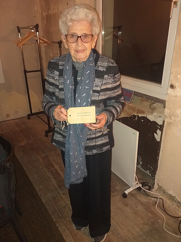 Lady Milena Grenfell-Bainesová s cedulkou, kterou dostala do transportu Nicholase Wintona.