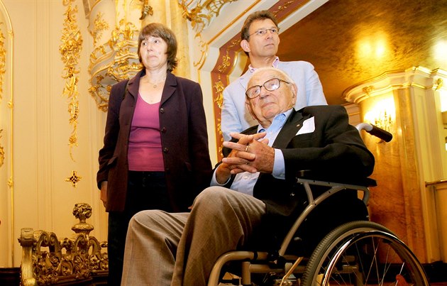 Sir Nicholas Winton s dcerou Barbarou a synem Nicholasem při návštěvě Prahy. (11. října 2007)