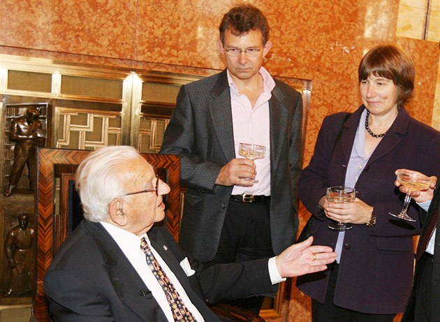 Sir Nicholas Winton s dcerou Barbarou a synem Nicholasem při návštěvě Prahy. (8. října 2007)
