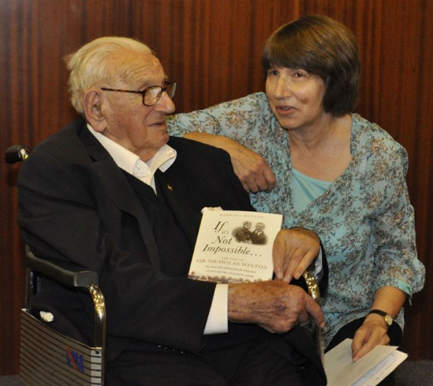 Barbara Wintonová se svým otce, Sirem Nicholasem, 19. května 2014 u příležitosti jeho 105. narozenin v sídle českého velvyslanectví v Londýně. Winton drží v ruce knihu, kterou jeho dcera napsala o jeho životě.