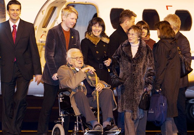 Nicholas Winton vystupuje ze soukromého letadla na starém pražském letišti v Ruzyni