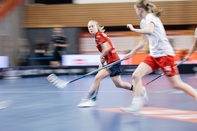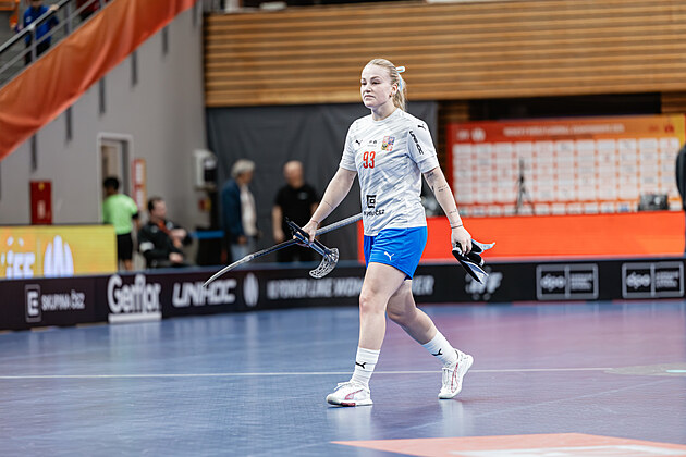 Také ženský florbal je někdy pořádný fičák. Na snímku česká útočnice Karolína Klubalová při úvodním zápase s Dánskem.