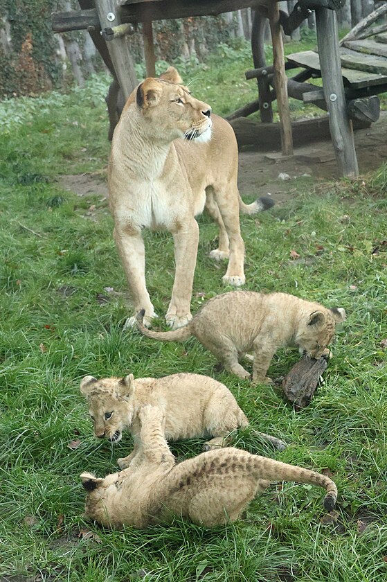 Trojice lvíčat berberských z hodonínské zoo už se pohybuje ve venkovním výběhu a zdokonaluje své dovednosti při různých hrách.