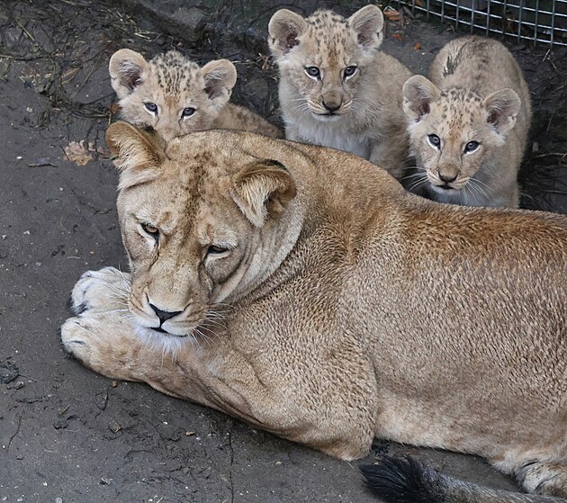 Trojice lvíčat berberských z hodonínské zoo už se pohybuje ve venkovním výběhu, stále je však pod bedlivým dohledem matky.