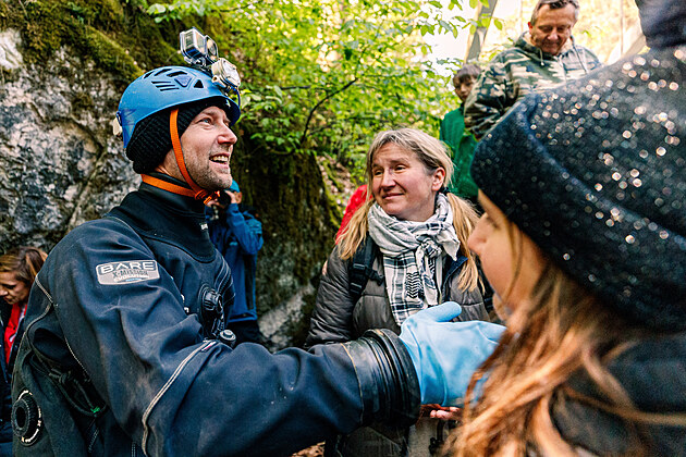 Trojice potápěčů zdolává dosud nepokořenou trasu šesti jeskyněmi v Moravském krasu. Je dlouhá přibližně 7,5 kilometru a jde o propojení Nové Rasovny s Macochou, které se dosud nikomu nepovedlo. Na snímku Radek Nejezchleb. (9. května 2025)