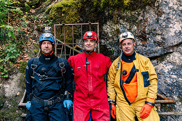 Trojice potápěčů zdolává dosud nepokořenou trasu šesti jeskyněmi v Moravském krasu. Je dlouhá přibližně 7,5 kilometru a jde o propojení Nové Rasovny s Macochou, které se dosud nikomu nepovedlo. Zleva Radek Nejezchleb, Petr Chmel a Jan Sirotek(9. května 2025)