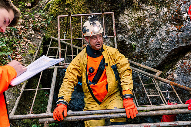Trojice potápěčů zdolává dosud nepokořenou trasu šesti jeskyněmi v Moravském krasu. Je dlouhá přibližně 7,5 kilometru a jde o propojení Nové Rasovny s Macochou, které se dosud nikomu nepovedlo. Na snímku Jan Sirotek. (9. května 2025)