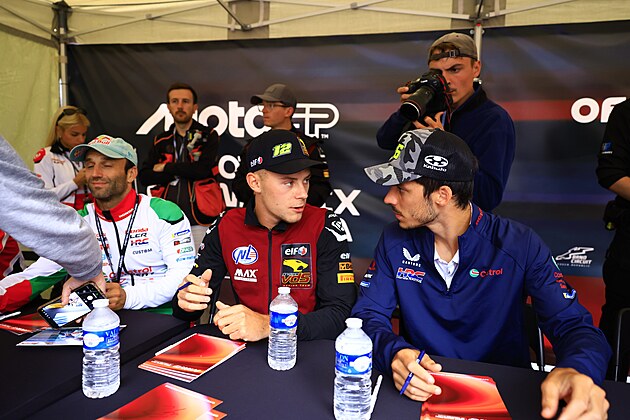 Filip Salač po boku dvojnásobného vítěze kategorie Moto 2 Johanna Zarca (vlevo), a vítěze šampionátu MotoGP z roku 2020 Joana Mira (vpravo). (17. července 2025)