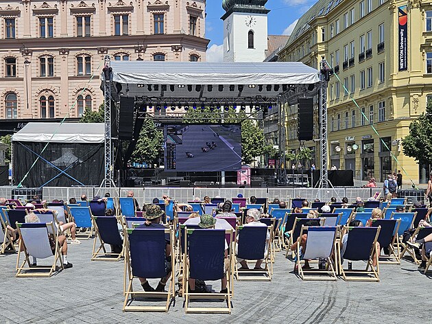 Ve fanzoně na náměstí Svobody v centru Brna sledovali lidé nedělní závod kategorie Moto2 s českým jezdcem Filipem Salačem v poklidné atmosféře. (20. července 2025)