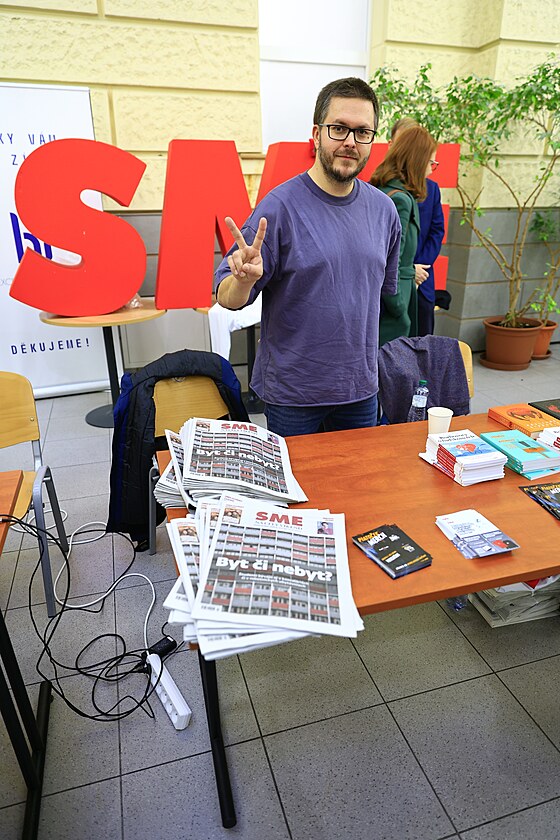 Stánek slovenského SME v rámci Multimediálního dne na Fakultě sociálních studií Masarykovy univerzity v Brně. (22. listopadu 2024)