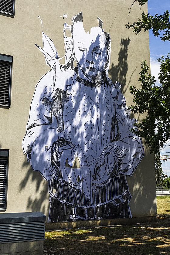Mural, nazvaný Tisíc jeřábů, od umělkyně Toy Box. Na zdi Masarykova onkologického ústavu vydržel oproti původním představám jenom necelý týden, než se roztrhal. (27. června 2025)