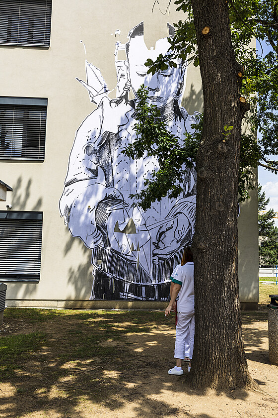 Mural, nazvaný Tisíc jeřábů, od umělkyně Toy Box. Na zdi Masarykova onkologického ústavu vydržel oproti původním představám jenom necelý týden, než se roztrhal. (27. června 2025)