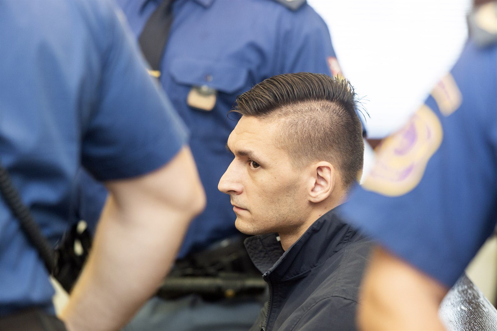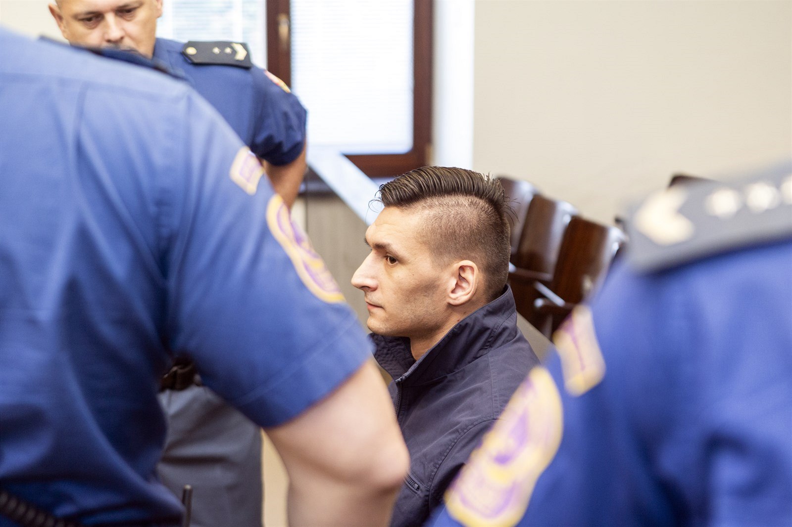Obžalovaného Radima Žondru přivádí ke Krajskému soudu v Brně, který se zabývá napadením tenistky Petry Kvitové. Žondra vinu odmítá. (8. 1. 2019)