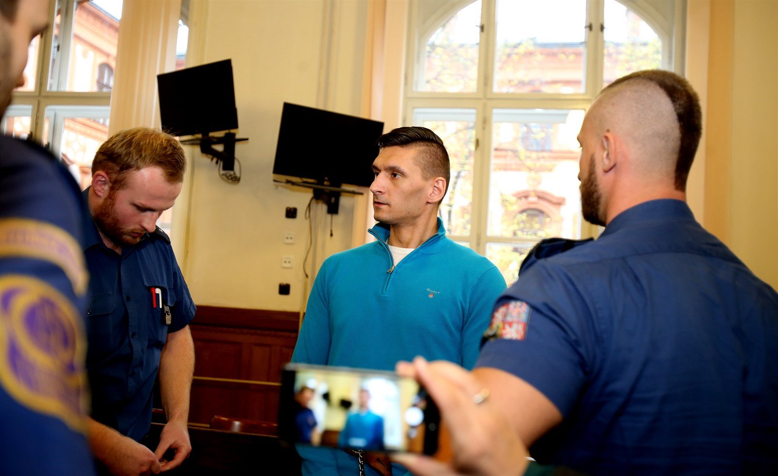 Obžalovaného Radima Žondru přivádí ke Krajskému soudu v Brně, který se zabývá napadením tenistky Petry Kvitové. Žondra vinu odmítá.