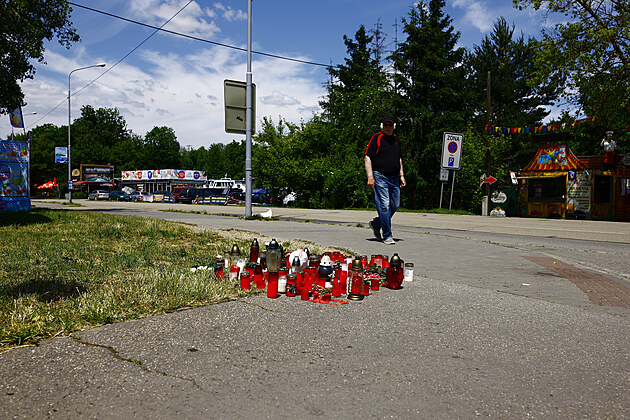 Na místě sobotní vraždy mladého Roma u Brněnské přehrady se objevily svíčky a květiny. (12. června 2023)