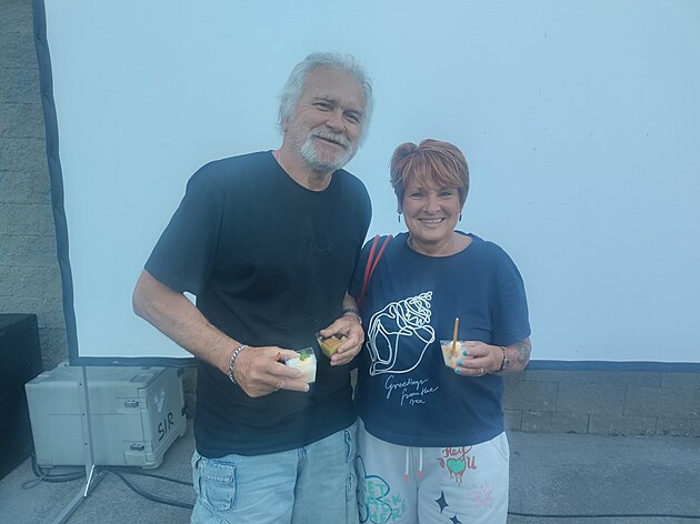 Manželé Tocháčkovi, pamětníci natáčení seriálu Návštěvníci. Při odhalení pamětní desky Adama Bernaua v brněnské Bráfově ulici si pochutnali na amarounech. (12. června 2025)