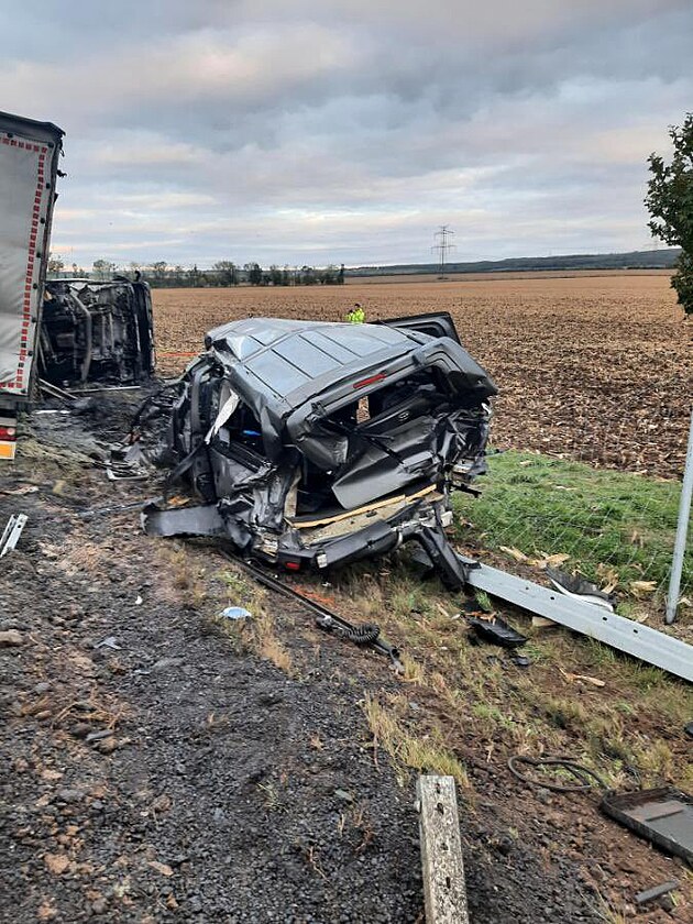 Nákladní vůz u Těšetic na Znojemsku narazil do osobního auta s přívěsem stojícím na kraji silnice I/53 směrem na Znojmo. (7. září 2025)