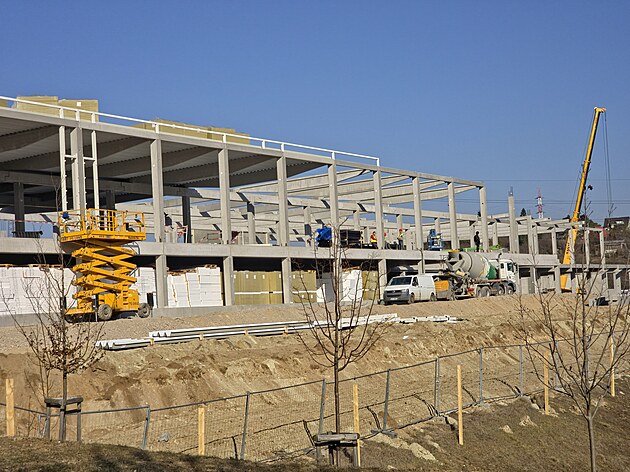 V tuto chvíli dělníci pracují na skeletu nového obchodního centra Kaskády a instalují střechu.