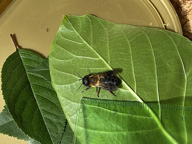 Samice včel z čeledi čalounicovitých, které se nově objevily na jižní Moravě, jsou nápadné nadměrnou velkostí přes dva centimetry. (červenec 2025)