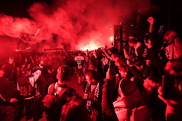 Příjezd mistrovských hokejistů Komety do Brna. Po návratu z Pardubic je přišlo přivítat na tisíc fanoušků. (30. dubna 2025)