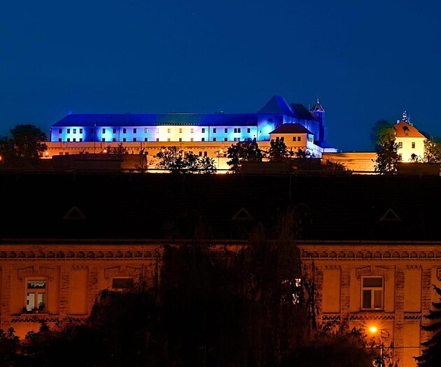 Na počest mistrovského titulu hokejové Komety Brno se Hrad Špilberk zahalil do modré barvy. (29. dubna 2025)