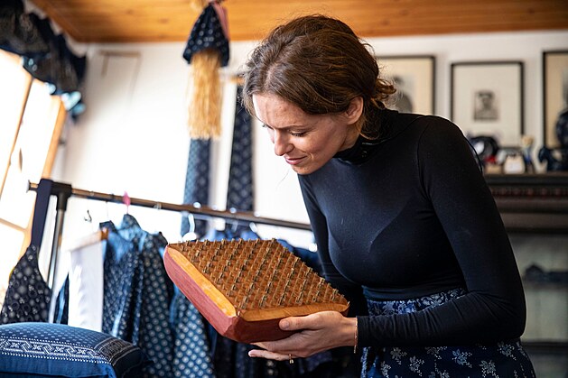 Návrhářka Zuzana Osako si v olešnické dílně Jiřího Danzingera prohlíží látky, ze kterých vznikne modrotisk pro olympioniky.