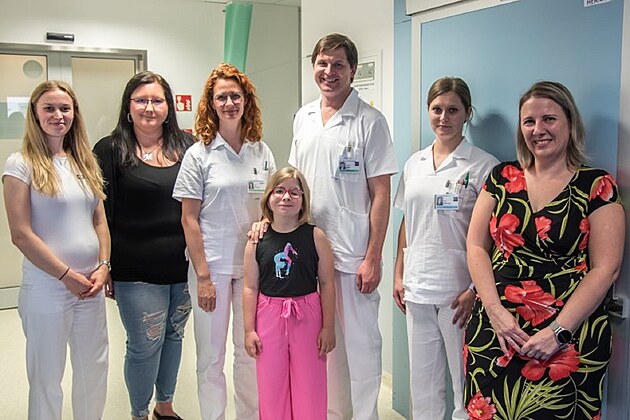 Na Klinice popálenin a plastické chirurgie Fakultní nemocnice Brno provádějí operaci zvanou reanimace obličeje, jež pomáhá lidem, kteří nemohou ovládat mimiku v obličeji. Na snímku pracovníci kliniky a pacientky Martina (druhá zleva) s Anetou a její matkou.