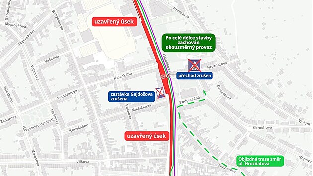Šoféři musí zároveň počítat s uzavřením křižovatky Gajdošovy s Kaleckého. Pro cestující MHD bude bez náhrady zrušena autobusová zastávka Gajdošova ve směru na jih.