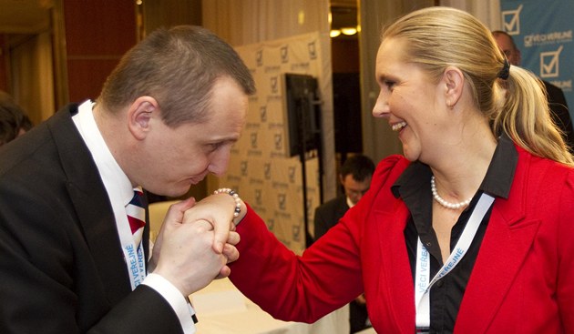Nově zvolený předseda Věcí veřejných Vít Bárta s Petrou Quittovou, kterou si vybral za místopředsedkyni.