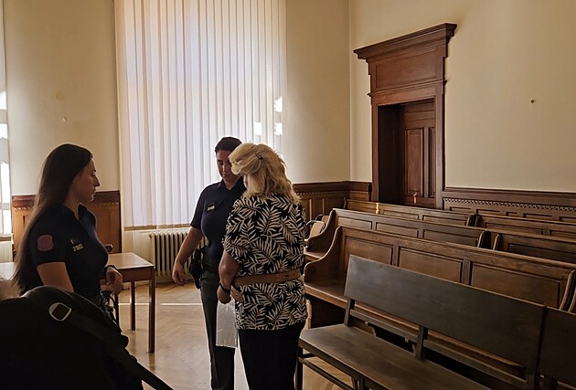 Po hádce v kuchyni žena (na snímku zády u soudu) nožem bodla svého partnera, ten zemřel. (červenec 2025)