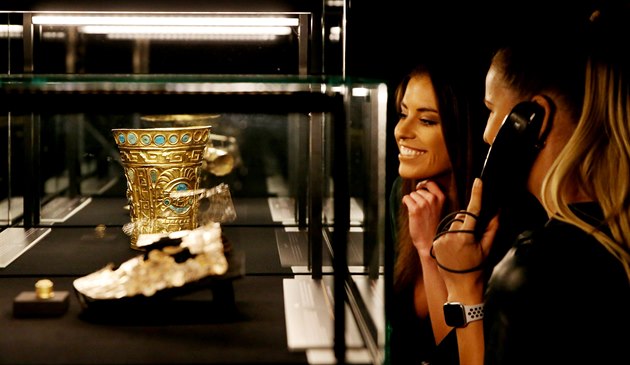 Typickým tvarem pohárů v peruánské historii je kero, toto je zdobené kameny chryzokolu a tyrkysu.