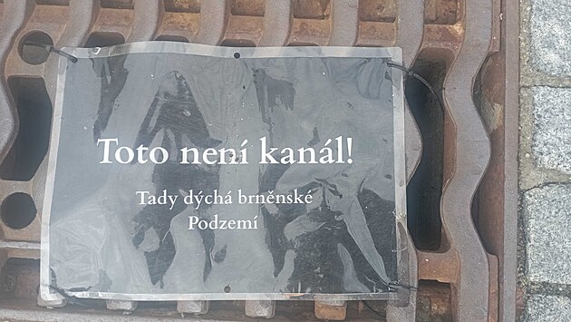 Cedule, která kolemjdoucí, ale především trhovce upozorňuje, že se nejedná o kanál. Relativně nedávno se objevil na Dominikánském náměstí před Novou radnicí v Brně. (září 2025)