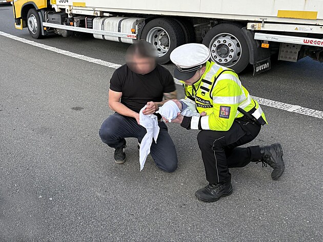 Brněnští dálniční policisté oživili měsíčního chlapečka bez dechu, se kterým u nich zastavili jeho rodiče. Na snímku praporčík Martin Učeň při zákroku.