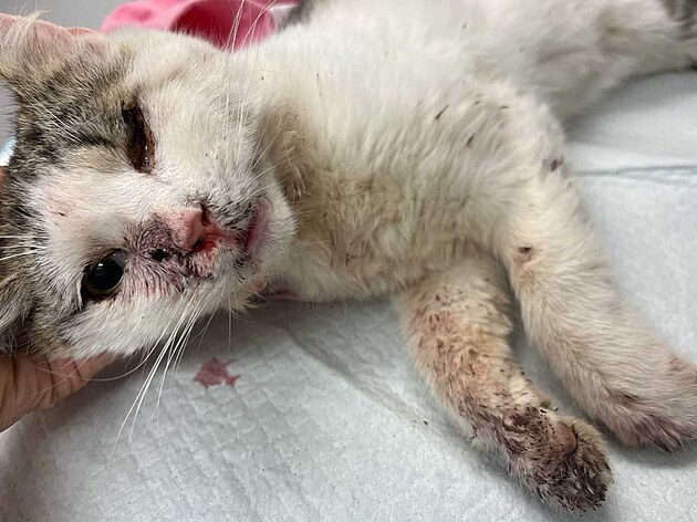 Zraněná kočka, kterou neznámý pachatel střelil ve Vícemilicích do hlavy. Zvíře utrpělo vážná poranění a hrozí mu trvalé oslepnutí.