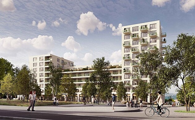 Podoba plánovaného polyfunkčního domu v brněnské Bystrci. Projekt vzbudil nevoli části obyvatel. (2025)