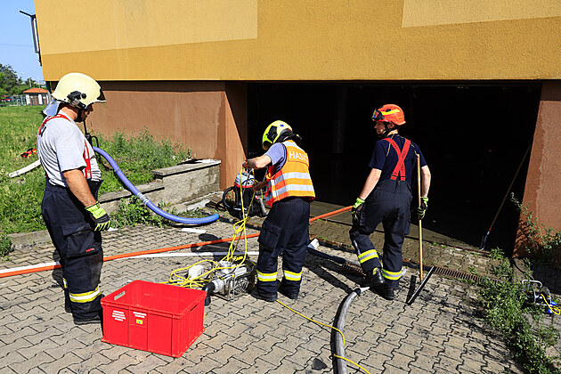 Následky požáru střechy bytového domu v brněnských Chrlicích. Vysušit je potřeba i garáže pod domem. (12. června 2025)