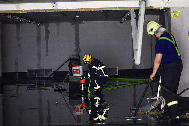 Následky požáru střechy bytového domu v brněnských Chrlicích. Vysušit je potřeba i garáže pod domem. (12. června 2025)