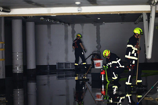Následky požáru střechy bytového domu v brněnských Chrlicích. Vysušit je potřeba i garáže pod domem. (12. června 2025)
