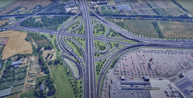 Vizualizace křížení dálnic D1 i D2 v Brně po rozšíření na šest pruhů. (říjen 2025)