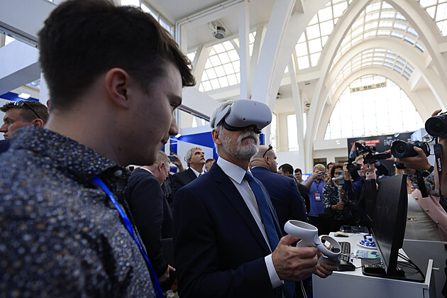 Prezident Petr Pavel si při návštěvě Mezinárodního strojírenského veletrhu v Brně vyzkoušel brýle pro virtuální realitu. (9.10.2024)