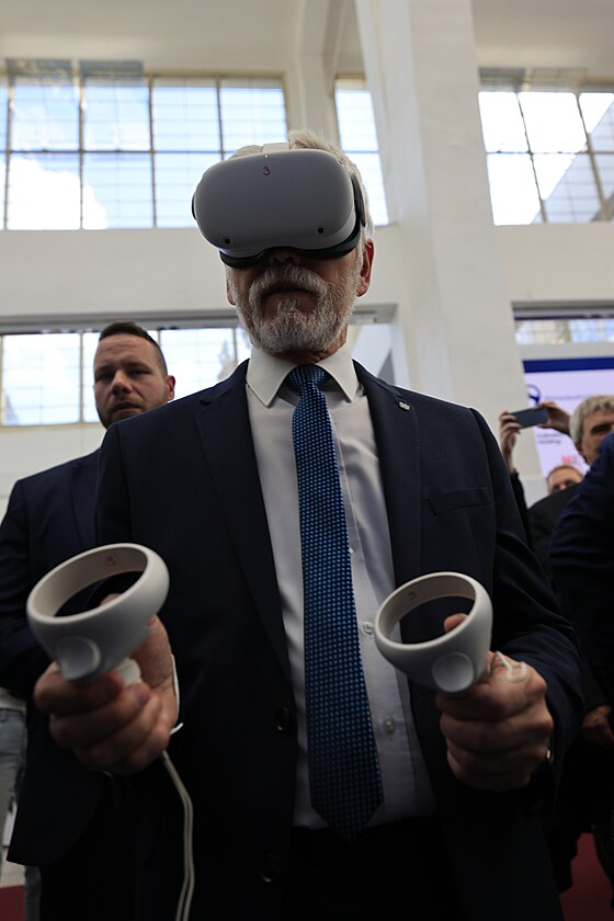 Prezident Petr Pavel si při návštěvě Mezinárodního strojírenského veletrhu v Brně vyzkoušel brýle pro virtuální realitu. (9.10.2024)
