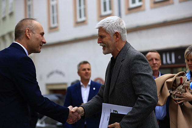 Prezident Petr Pavel se svou ženou Evou přijel v úterý 12. listopadu 2024 na návštěvu Znojma. Na snímku s jeho starostou Františkem Koudelou.