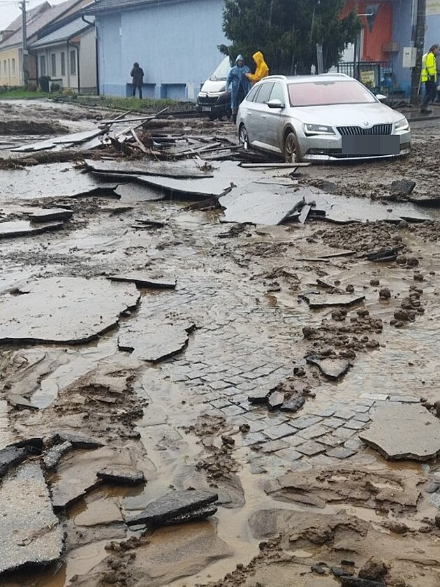 Situace po přívalových deštích v Domaníně na Hodonínsku, kde voda poškodila komunikace i domy. (24. dubna 2024)